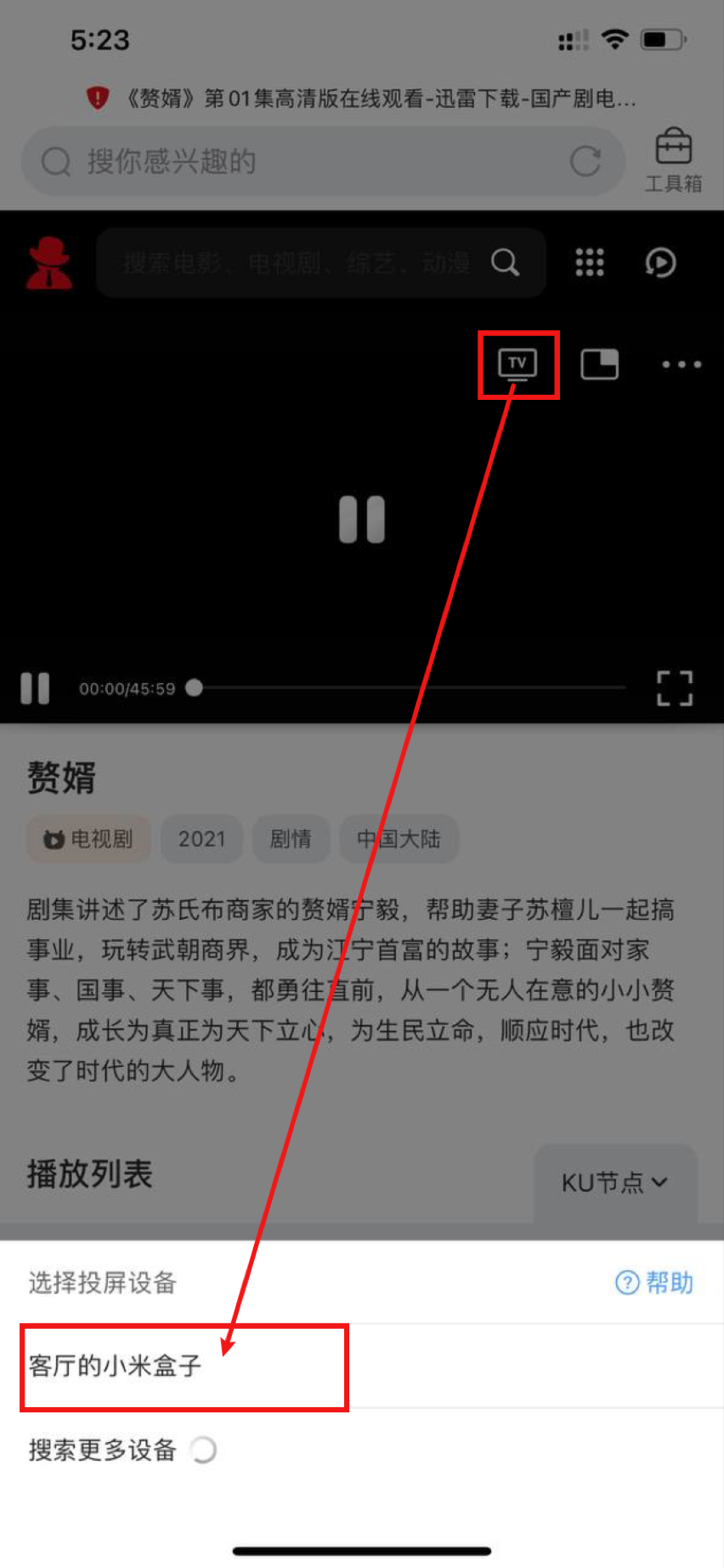 打开QQ浏览器(会接管网页播放器)->打开风车动漫-专注动漫的门户网站->播放视频->选中投屏图标->等待搜寻出智能电视/电视盒子->选中,即可投屏。