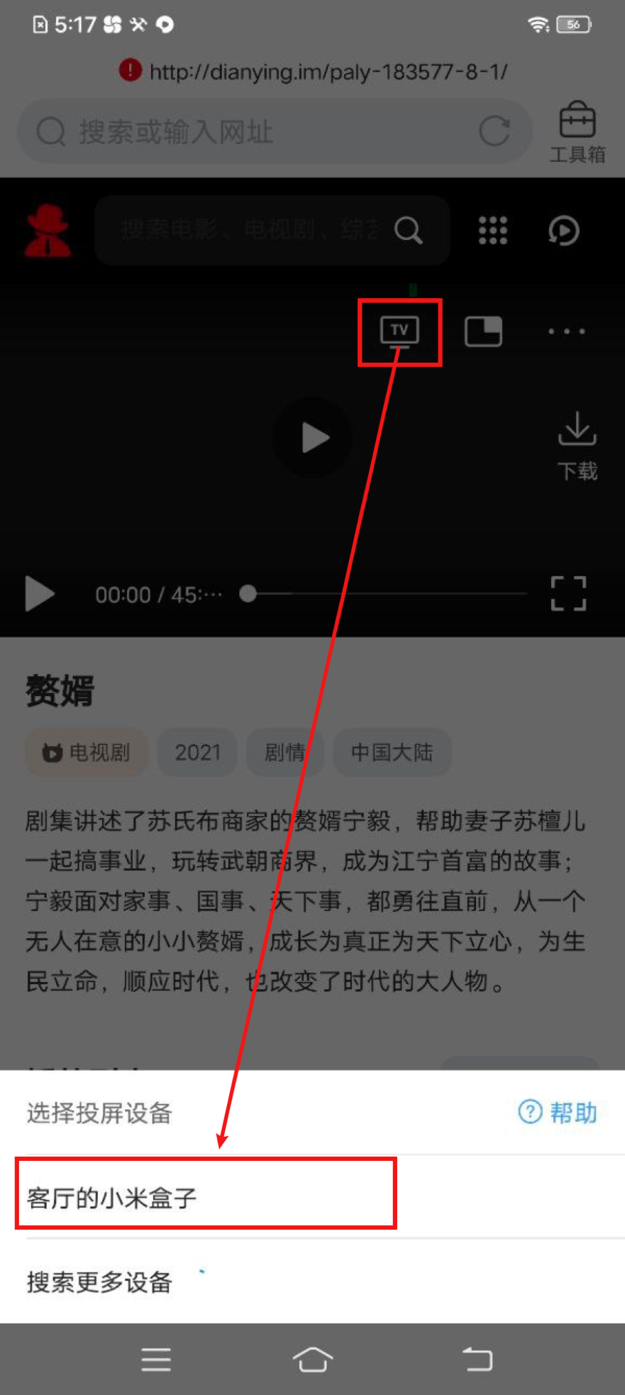 安卓夸克浏览器->打开风车动漫-专注动漫的门户网站->开始播放->全屏->左下角投屏->等待搜寻到智能电视/电视盒子->选中,即可投屏。